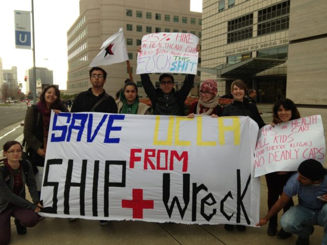 A group of about 30 students and workers gathered outside of the Arthur Ashe Student Health and Wellness Center this afternoon to protest a proposed premium hike and existing lifetime benefit caps for students on the University of California Student Health Insurance Program.