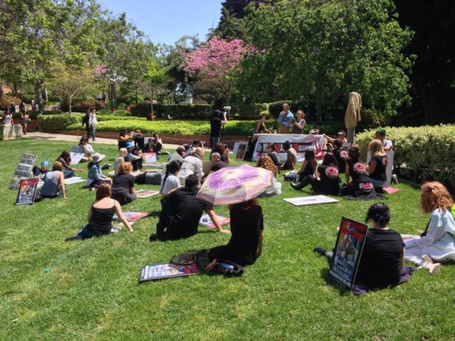 During the protest, participants gathered in front of Kerckhoff Hall and marched to the corner of Le Conte Avenue and Westwood Boulevard. They stopped in front of the Ahmanson Lovelace Brain Mapping Center, the Jules Stein Eye Institute and the Semel Institute for Neuroscience and Human Behavior along the way, chanting phrases like “You are murderers, you are torturers.”