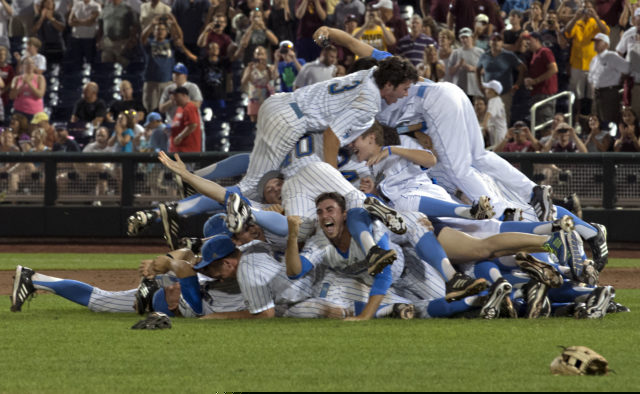 Minutes after the team had been announced as the 2013 national champions after a comprehensive 8-0 win over Mississippi State to sweep the College World Series finals, the Bruins doused their coach, John Savage, in an icy bath on a humid summer night in Omaha, Neb.