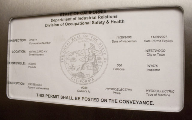 According to Subchapter 6 of the Division of Occupational Safety and Health’s Title 8 regulations, which governs elevator safety orders, “no elevator shall be operated without a valid, current permit issued by the Division.”
