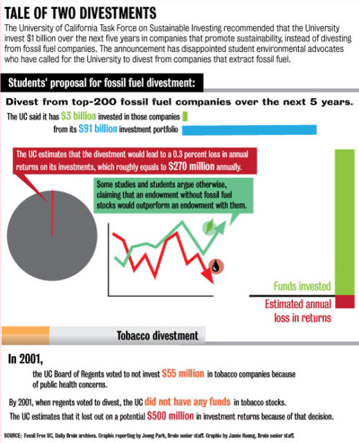 UC spokeswoman Dianne Klein said the University’s estimate showed that divesting from fossil fuel companies can cost millions in transaction costs for selling and buying stocks and would lessen the University’s overall investment returns. On Friday, Klein said divesting from fossil fuel would have led to an annual loss of 0.3 percent in returns for the UC’s investment portfolio, which is about $270 million a year.