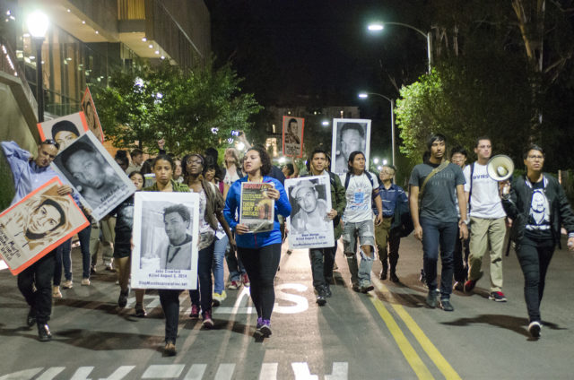 The protesters, many of them students, called for reform of the criminal justice system, which they perceive to be biased against racial minorities. They took to marching around campus and then down to Westwood minutes after it was announced in Ferguson Monday night that no charges would be brought against white police officer Darren Wilson, who shot Brown.