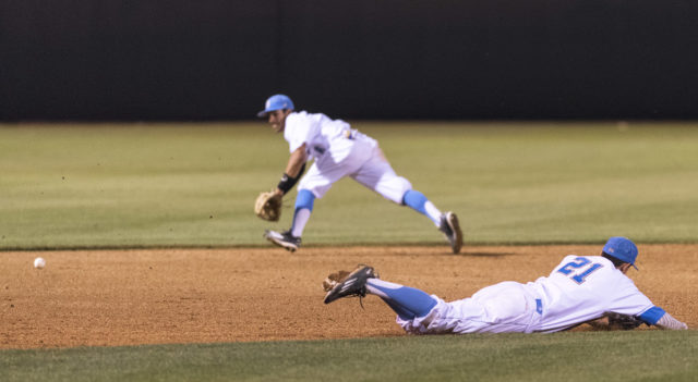 Fullerton left fielder Dalton Blaser hit a line drive through the left side, which brought the runner home from third base. Then – on the same play – UCLA junior left fielder Brett Stephens struggled with fielding the bouncing ball as it entered his glove. Stephens’ error allowed another run to score.