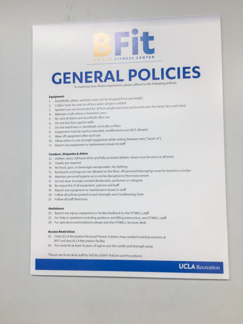 She admits that the full-backed shirt rule is not as clear as it should be, both in language and accessibility. In the Bruin Fitness Center, the bulletin board of rules resides in the back the weight-lifting area, making it easy for students to miss. The small font and ambiguous wording of the rule make it even less accessible to students.