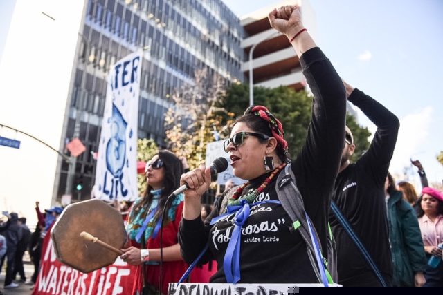 The march reached Los Angeles City Hall around noon, where more speakers denounced Trump and called on people to resist tyranny.