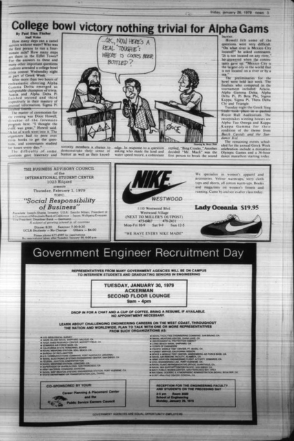 While the fancy merchandise probably only recently entered the UCLA trivia scene, the trivia games themselves have been going on for a while. In fact, the Daily Bruin published a story on Jan. 26, 1979, about that year’s College Bowl competition. According to the story, the preliminary rounds for the bowl were held the week prior, but what’s to note is that the competition primarily involved members of Greek life.