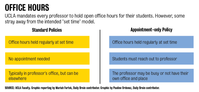 Aaron Bautista, a fourth–year human biology and society student, is no stranger to this problem. In his two years at UCLA, half of his professors have had appointment-only office hours, a policy which he thinks discourages student involvement.