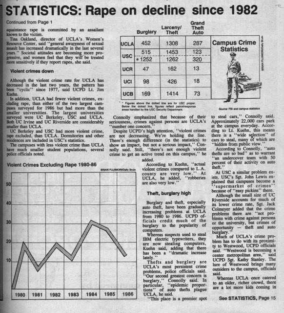 Bruins were rightly concerned about campus safety. The campus had been seeing a notable number of attempted sexual assaults and actual sexual assaults at the time. A Daily Bruin story published Feb. 11, 1987, reported there was a sudden increase in the number of rapes and attempted rapes on campus in 1986 – six that year, which was up four from the year prior. The Bruin also reported UCLA was ranked the second-highest among five UC campuses in 1986 for rapes and attempted rapes.