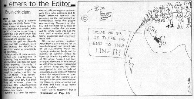 “Once again, it seems appallingly evident that our Daily Bruin has published unwarranted speculative accusations against SLC,” the administrative vice president continued. “To have the gaul to blatantly report that SLC vacations were being financed by ASUCLA (Associated Students UCLA) is beyond the realm of plausibility and legitimacy.”
