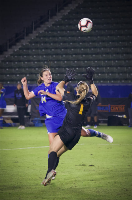 With Trojan goalkeeper Kaylie Collins out of the goal, the match was decided by a header by sophomore midfielder Olivia Athens that flew over the goalkeeper and into the back of net and the Bruins rushed the field.
