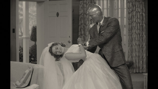 Despite the self-aware meta humor, the episode lovingly commits to telling an insular story within the sitcom format. As such, the sharp dialogue actually manages to get some unironic laughs, paying tribute to the era’s comedic timing while alluding to Wanda’s and Vision’s cinematic backstories – a clever duality that also carries over into episode two. For example, when Wanda teases her husband for his indestructible head, fans will also recognize a double entendre that darkly references his unfortunate demise in “Avengers: Infinity War.”