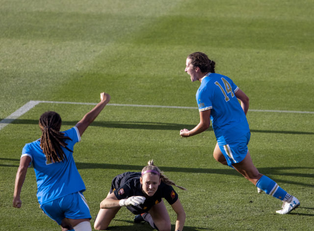UCLA fell behind early in the first half, when sophomore defender Brianne Riley sprinted alongside USC forward Penelope Hocking but was unable to prevent the Trojan from sending a blast past redshirt junior goalkeeper Lauren Brzykcy’s left side 10 minutes into the contest.