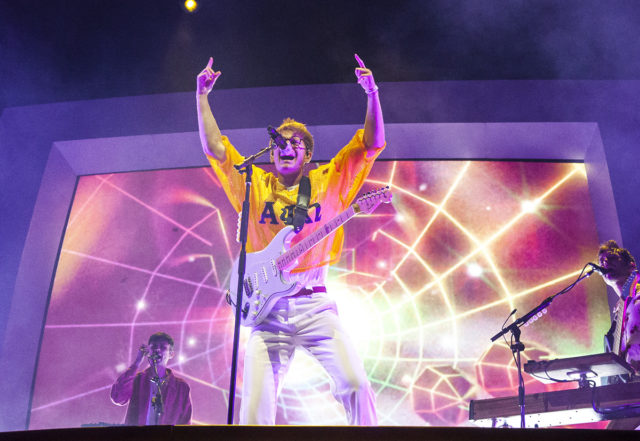 Though unassuming at first glance, the band’s stage setup cleverly brought to life the album cover of their latest record, “Dreamland.” All set pieces were an identical pastel purple, with replicas of the album art’s diving board, basketball hoop and pyramid. While this color palette would’ve been monotonous on its own, the humdrum benefited from flashing neon signs hung across the stage that added some zest.