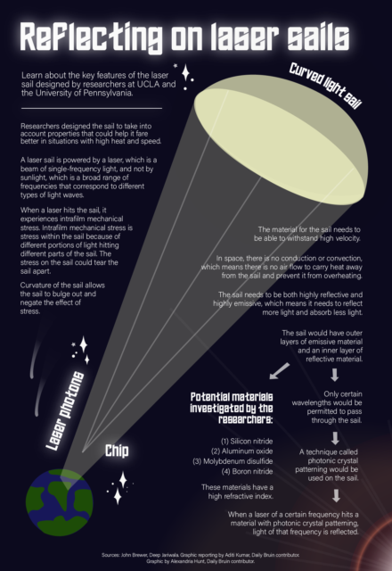 John Brewer, a doctoral student in material science and engineering at UCLA and co-author of the study, said the sail is a type of light sail powered by a laser, a beam of light with a single frequency. The light particles possess momentum, and when a laser shone from Earth hits the sail, the momentum causes the sail to move.