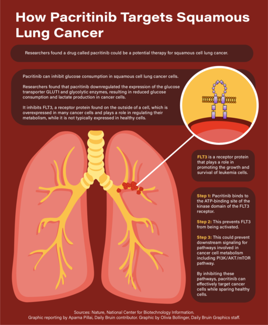 According to the paper, the drug, pacritinib, can reduce glucose consumption in squamous cell lung cancer cells by targeting the FLT3 protein, which is found in many cancer cells and plays a role in promoting their growth and survival via glucose consumption. Cancer cells require glucose to survive and grow, said Peter Clark, assistant professor in the Department of Molecular and Medical Pharmacology at the David Geffen School of Medicine and senior author of the study, which was published in January. Clark added that researchers have previously attempted to target the glucose consumption of cancer cells, but this had inhibited healthy, vital tissues from growing.
