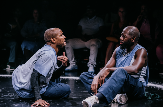 One of the most powerful moments toward the end of the 90-minute play is McKinney’s striking monologue, where he exposes Ogun’s long harbored resentment and closeted jealousy toward his brother, unmasking his vulnerability in an impassioned fit of rage while Oshoosi crouches in tears below him. This profound and long-awaited breakthrough creates a tender and tough atmosphere, released when Ogun drives his point home and kisses Oshoosi on the head, once again reminding Oshoosi of his unwavering brotherly love.