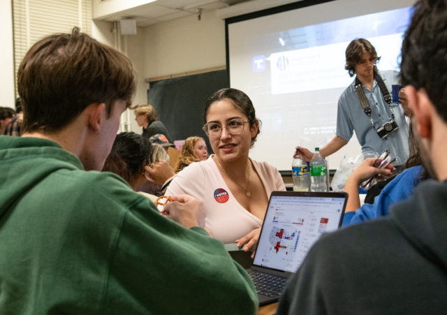 Emily Henschel, a third-year communication student attending a Bruin Democrats watch party at Royce Hall, said living with parents with an opposing political ideology causes tension within her family. She said she considers herself a liberal Democrat, but her parents are conservative Republicans, adding that she is nervous about the results of the election.