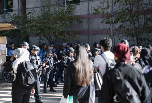At 1:30 p.m., around 150 protesters blocked access to Bruin Plaza from Bruin Walk during a Students for Justice in Palestine protest calling on the UC to divest from companies associated with the Israeli military and standing with University employees in advance of AFSCME 3299’s announced strike tomorrow and Thursday.