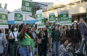 Around 45 picketers have gathered in Bruin Plaza as of 6:15 a.m., with more joining rapidly. AFSCME Local 3299 members set up tables to pass out shirts, signs and water as people arrive.