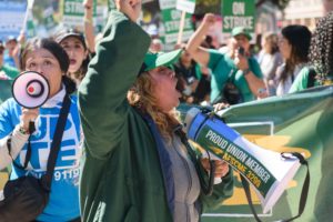 Around 300 members of AFSCME Local 3299 picketed in front of De Neve Residential Restaurant around 10:15 a.m. Members then began marching up De Neve Drive toward Sproul Plaza while using noisemakers, horns and drums.