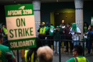 Around 10:40 a.m., the AFSCME Local 3299 picket line left Covel Commons. The picket line paused briefly outside the UCLA Hilltop Shop before marching toward De Neve Plaza.