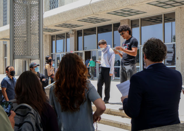 About 30 people gathered outside the Los Angeles Metropolitan Courthouse around 12:40 p.m. to rally in support of Kupsh. Supporters gave speeches before and after the court session and chanted “The students, united, will never be defeated.”