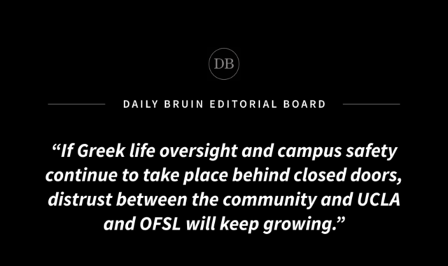 Students cannot feel safe or trust in UCLA leadership without transparency. If Greek life oversight and campus safety continue to take place behind closed doors, distrust between the community and UCLA and OFSL will fester and continue to grow. A public university should publish its information.