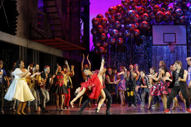 Soon after, the feud reaches a turning point at the neighborhood dance. Zambello underscores the scene’s importance with a grand visual shift, as bundles of balloons and glittering streamers descend from the ceiling to transform the cityscape. As the full ensemble takes the dance floor for a beautifully synchronized Latin routine, swirling skirts fill the stage with vibrant colors. Amid all the commotion, protagonists Maria (Gabriella Reyes) and Tony (Duke Kim) find each other, which kicks off the story’s fateful romance in a tender moment of contrast.