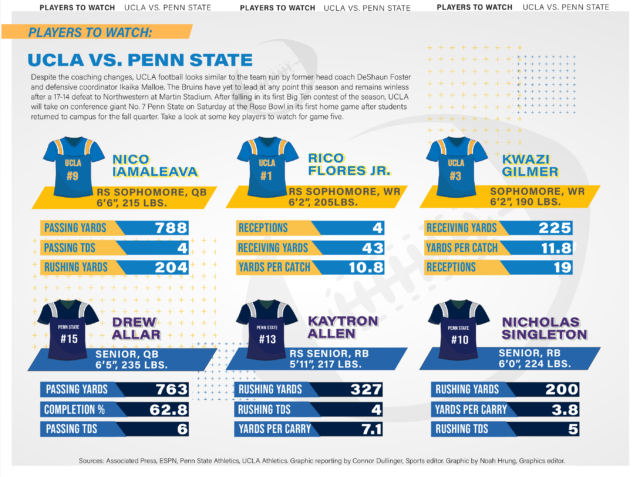 In its first game following the departure of the big three – former head coach DeShaun Foster, defensive coordinator Ikaika Malloe and offensive coordinator and quarterbacks coach Tino Sunseri – UCLA football (0-4, 0-1 Big Ten) will return to the Rose Bowl on Saturday to play No. 7 Penn State (3-1, 0-1) in the first home game since the start of UCLA’s academic year. The Bruins are 4-3 all-time against the Nittany Lions and last faced off in 2024 at Beaver Stadium, where they fell 27-11.