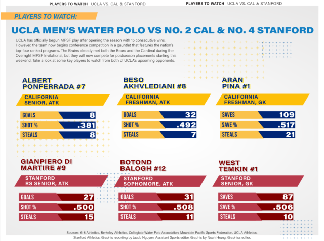 No. 1 UCLA men’s water polo (15-0) has not lost a match since Nov. 24. With a perfect start to the 2025 campaign thus far – and an opportunity to repeat as national champions – the Bruins begin MPSF play with two weekend matches against familiar foes. The squad will first face No. 2 California (11-1) at the Spieker Aquatics Complex in Berkeley on Saturday before taking on No. 4 Stanford (8-2) at the Avery Aquatic Center in Stanford, California, the following day. Daily Bruin senior staffer Ava Abrishamchian provides a scouting report for both opponents heading into the games.