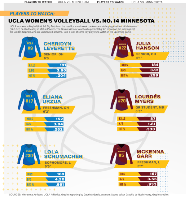 The Gophers’ defensive prowess has limited opponents to a sub-.200 hitting percentage, which could spell trouble for a Bruins’ attack that sports the third-lowest conference hitting percentage with a .231 clip.