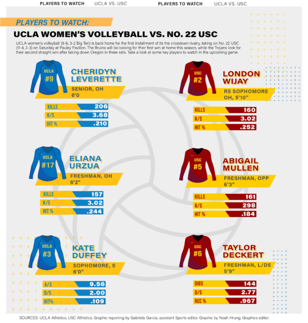 UCLA women’s volleyball (9-6, 3-2 Big Ten) returns to Pauley Pavilion on Saturday, fresh off upsetting No. 14 Minnesota on Wednesday, to face No. 22 USC (11-4, 2-3). Both the Bruins and Trojans lost to the Hoosiers and Boilermakers last week before sweeping their respective midweek opponent. Daily Bruin senior staffer Kai Dizon gives his take on USC’s squad.