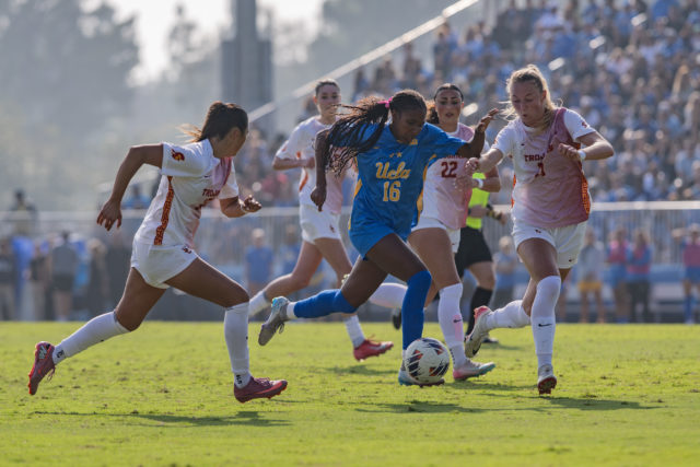 But the Bruins’ first-half offense was largely stifled, encountering a high-energy Trojan back line that forced double – and sometimes triple – coverage situations in the final third. Forward Bella Winn drew considerable attention, with defenders playing tight on the redshirt freshman from the opening whistle, at times almost piggybacking her step for step.