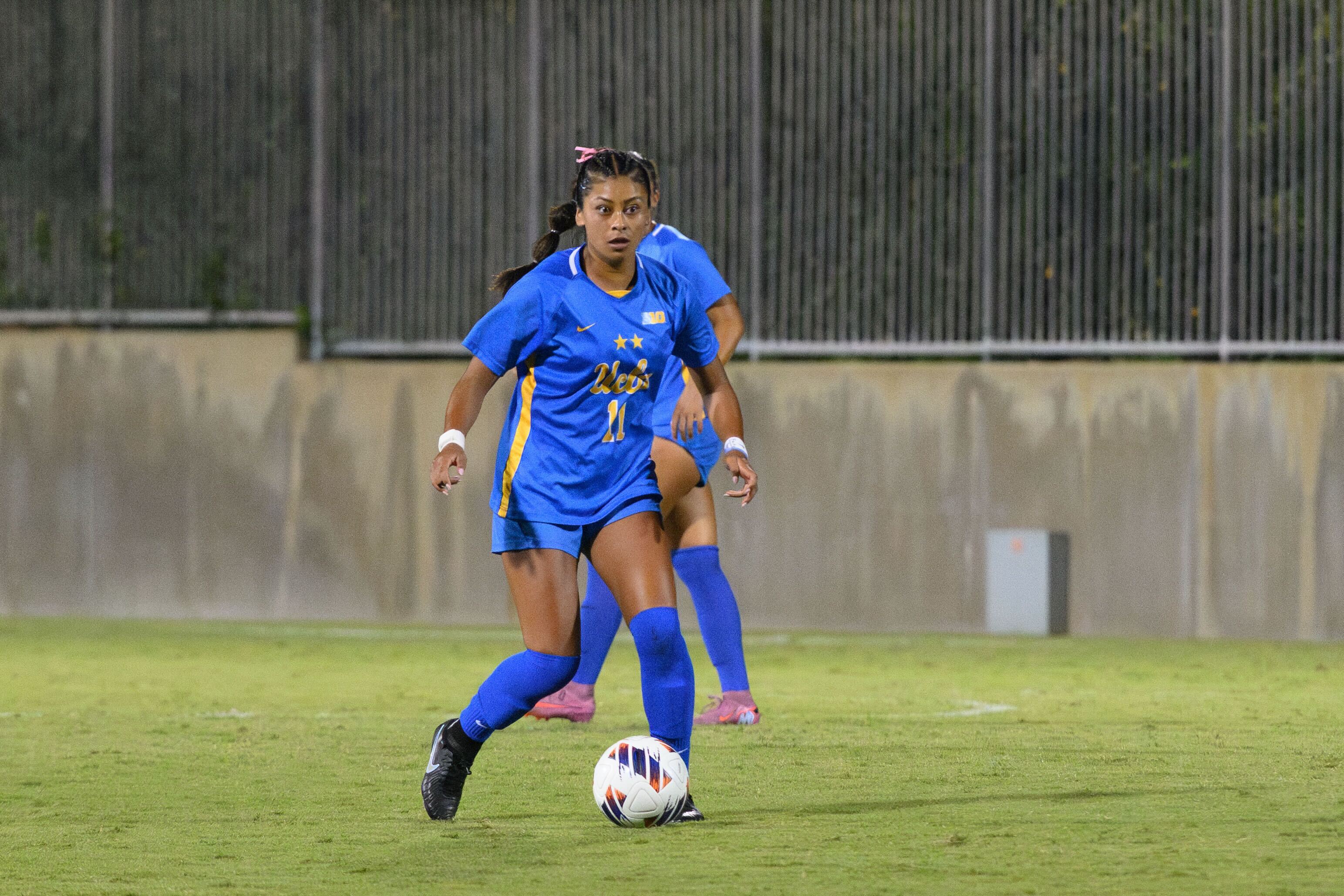 The Bruin attack made its first move in the 11th minute, when senior forward America Frias slid a quick touch to redshirt senior Emma Egizii, who received the ball with her back to the goal. The midfielder spun 180 degrees, lasering a high-velocity shot into the left corner. Spartan goalkeeper Noelle Henning dove with arms outstretched, but the ball sailed beyond her grasp and into the net.