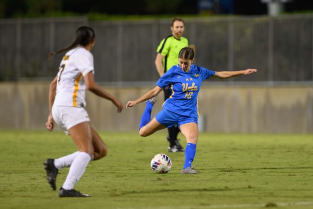 The Bruin attack made its first move in the 11th minute, when senior forward America Frias slid a quick touch to redshirt senior Emma Egizii, who received the ball with her back to the goal. The midfielder spun 180 degrees, lasering a high-velocity shot into the left corner. Spartan goalkeeper Noelle Henning dove with arms outstretched, but the ball sailed beyond her grasp and into the net.