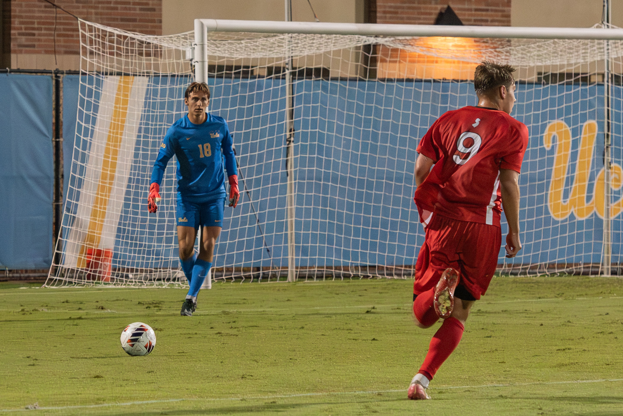 The Bruins found space in the 13th minute to play through freshman midfielder Ander Marticorena. The Spaniard ran onto a through ball in the left channel to cross to Solans Ormo, who turned, controlled the ball and fired from the center of the six-yard box.