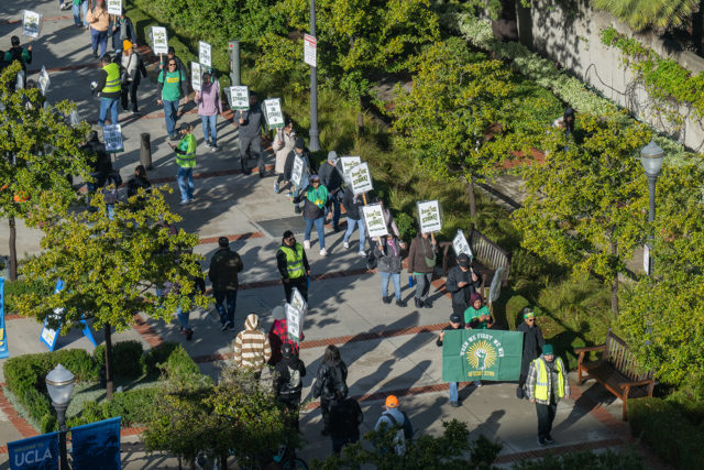 Members of AFSCME Local 3299 picketed between Ackerman Union and the Luskin Conference Center, using sirens and chanting, “UC, UC, you’re no good, treat your workers like you should.” The UC Regents’ Health Services Committee is set to discuss collective bargaining during a closed session Tuesday.