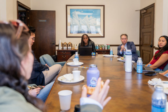 After Kite introduced himself, he opened the conversation to the students. Kite said he was open to answering all questions except ones about union negotiations, citing a need to “stay neutral” on the topic.