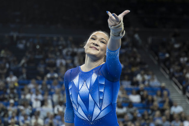 Upbeat pop music filled Pauley Pavilion as bedazzled leotards sparkled and white puffs of powder danced in the air at the Bruins’ home opening meet Jan. 17. No. 9 UCLA gymnastics defeated Nebraska 197.325-195.250. Senior Jordan Chiles led the Bruins, earning her first perfect 10 on vault and her third straight all-around win.