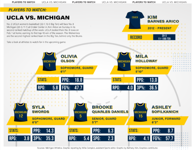 Three UCLA guards shoot above 41% from deep off at least 26 attempts. Graduate student Gianna Kneepkens averages 2.4 made 3-pointers per game with 46.8% accuracy, and senior Kiki Rice and graduate student Charlisse Leger-Walker shoot 46.2% and 41.9%, respectively, from deep. The starting Bruin guards also have a combined 62 steals against Big Ten opponents, and their ability to disrupt plays should prove handy against a Wolverine backcourt that has committed a collective 101 turnovers in conference play.