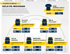Michigan took a 17-13 lead into the second quarter thanks to UCLA’s 33% clip from the field and 1-for-6 shooting from beyond the arc – both well below its season averages of 52% and 38.5%, respectively.