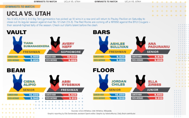 No. 5 UCLA gymnastics (14-2, 9-0 Big Ten) will close out its regular season against rival No. 12 Utah (13-3, 6-0 Big 12) at Pauley Pavilion on Saturday. Both squads have clinched their second consecutive conference championships, and the match could foreshadow postseason battles on the horizon. Daily Bruin contributor Sofia Celis analyzes the Red Rocks ahead of the clash.