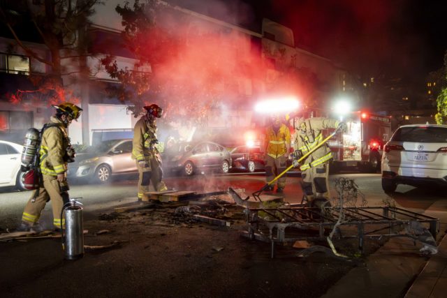 A fire truck arrived on the scene at 10:35 p.m., and firefighters fully extinguished the flames soon after. Firefighters then moved leftover debris out of the middle of the street, and the crowd fully dispersed by 10:45 p.m.