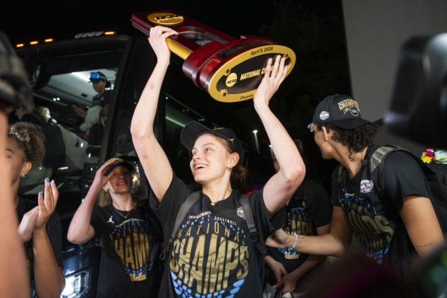 Following the program’s first NCAA national title win in Phoenix, UCLA women’s basketball returned to Westwood on Sunday night. The milestone marks the second national title win for a women’s basketball team in the Big Ten and UCLA women’s basketball’s second national title overall, following its AIAW title win in 1978. Airhorns and 8-claps soundtracked the celebration at the Mo Ostin Basketball Center as onlookers asked for autographs and selfies to document the historic win until shortly after 10 p.m.