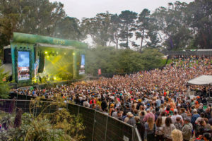 Photo: A crowd at Sutro stage watches a set with green and yellow lighting. The third day of Outside Lands brought performances from DJs and indie acts. (Isabella Appell/Daily Bruin)