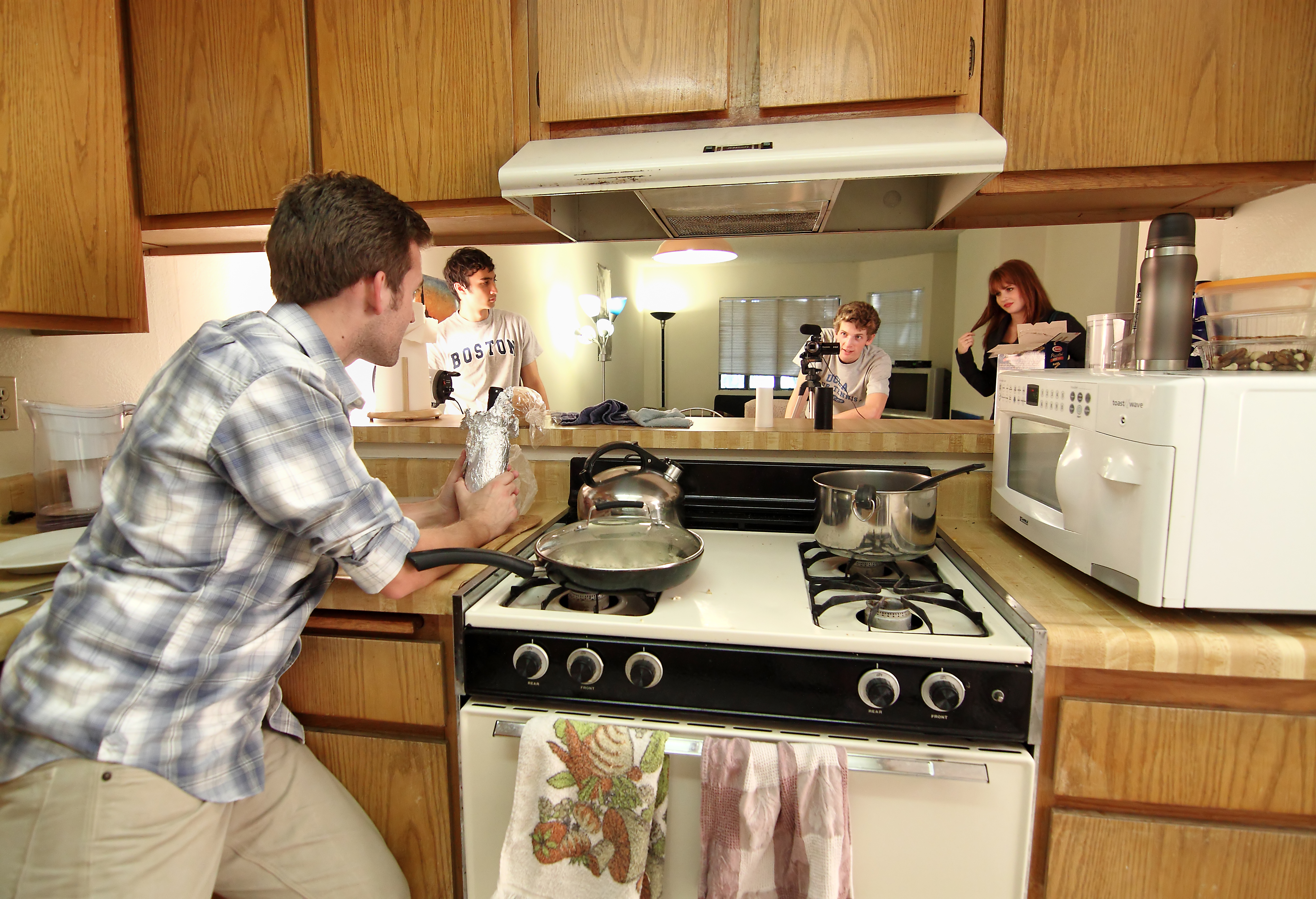 Third-year applied mathematics and English creative writing student James Simenc (second from right) works the camera during filming of “Good Night.”