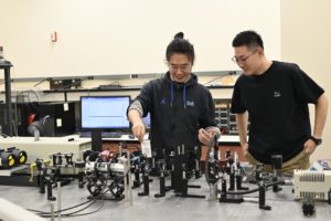 Photo: Li (left) works with the lab’s spectroscopy setup as part of his experimentation work, and Su (right) assists with theoretical work. (Hannah Morgan/Daily Bruin senior staff)