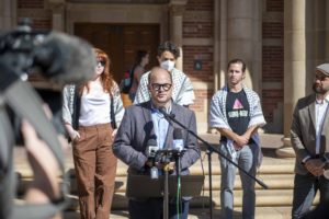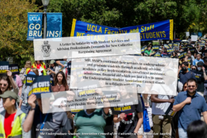Photo: Fragments of USAC’s letter in support of student services and advising professionals are layered over a picture of UAW Local 4811’s April protest against federal funding cuts. The council requested Adriana Galván, the dean of undergraduate education, to deliver its demands to UC President James Milliken. (Photo by Andrew Ramiro Diaz/Photo editor. Design by Erin Brauer/Daily Bruin)