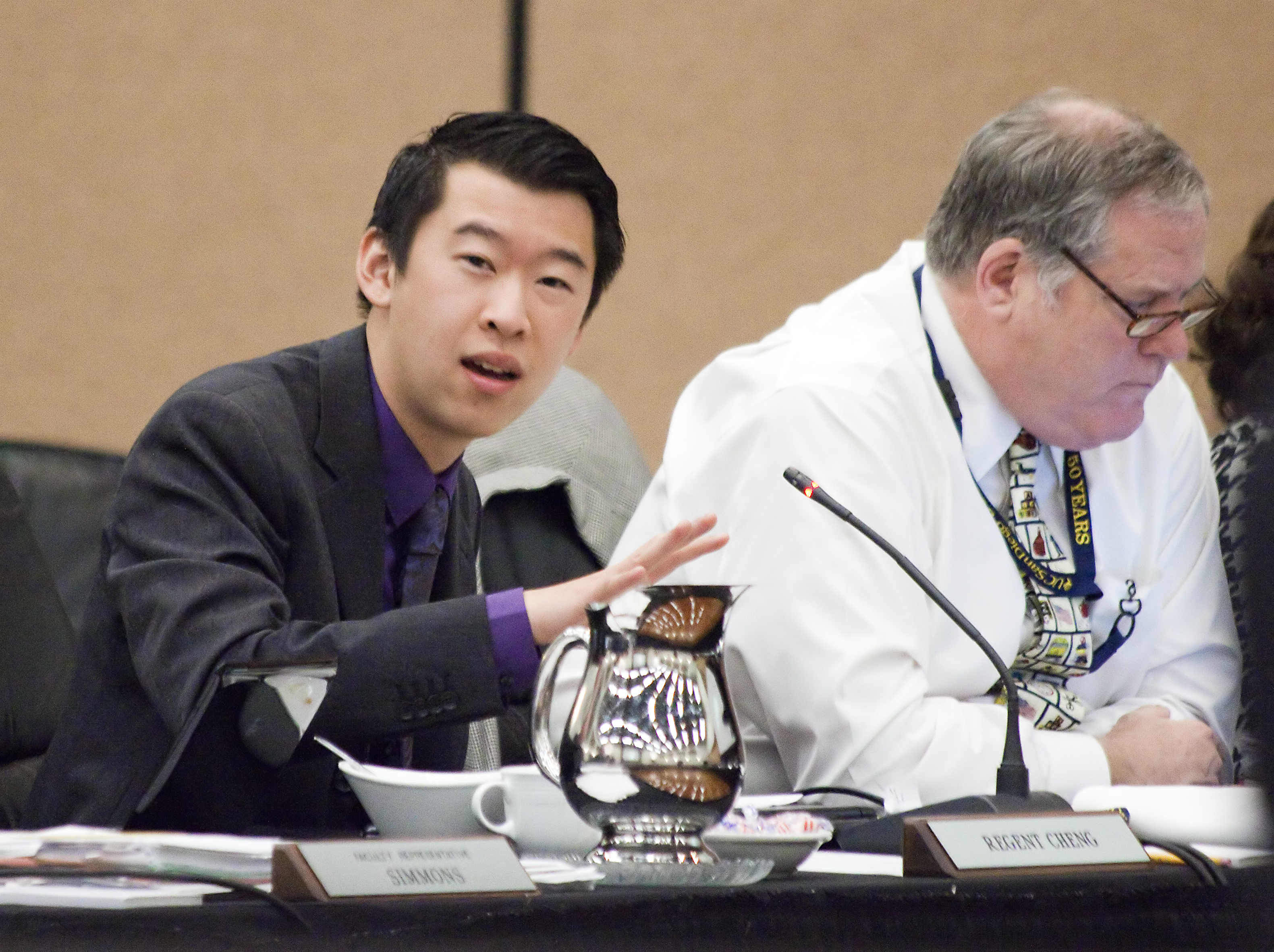 Student Regent Jesse Cheng and President of Alumni Associations of UC Rex Hime spoke at the regents’ meeting in San Diego.