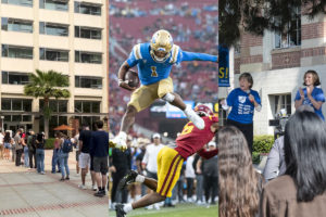 Photo: Left to right: Students wait outside Rendezvous, senior quarterback Dorian Thompson-Robinson scores a touchdown, and lecturers lead a celebratory rally after negotiating a new contract with the University of California. (Left to right: Constanza Montemayor/Daily Bruin senior staff, Ashley Kenney/Photo editor, Kyle Kotanchek/Daily Bruin)